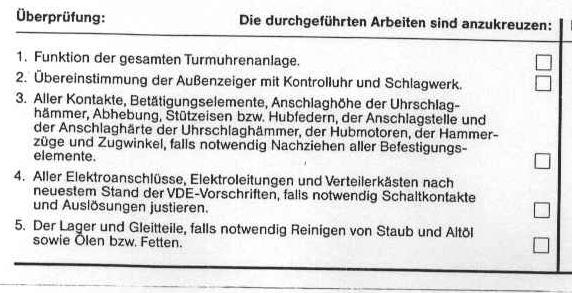 Wie sie aus den abzuarbeitenden Punkten erkennen, ist es nicht damit getan, mal eben nur über die Glocken zu schauen. Bei einem vierstimmigen Geläut liegt der Zeitaufwand im Schnitt bei 2 Stunden. Achten sie also darauf, daß sie hier gut bedient werden. Nachfolgend aufgeführte Uhrenwartung hat einen Zeitaufwand von ca. 45 min , je nach Uhrenausführung aber auch länger.